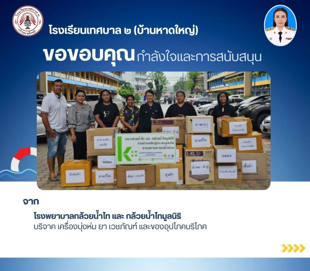 ผู้บริหาร แพทย์ พยาบาล เจ้าหน้าที่ และพนักงาน กลุ่มบริษัทโรงพยาบาลกล้วยน้ำไท และกล้วยน้ำไทมูลนิธิ ได้ร่วมบริจาคสิ่งของอุปโภค บริโภค เครื่องนุ่งห่ม ยาและเวชภัณฑ์ เงินบริจาค รวมถึงสิ่งของที่จำเป็นต่างๆในการยังชีพ ให้กับผู้ประสบอุทกภัย ณ โรงเรียนเทศบาล 2 (หาดใหญ่) จังหวัดสงขลา